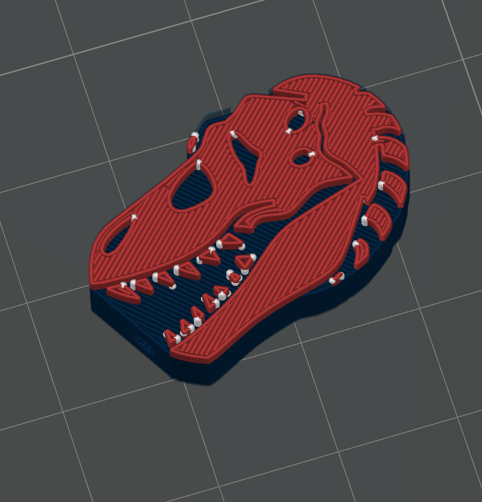 Trex skull bead. Made using an AI graphic generator, into an SVG tracer, into Blender3D.